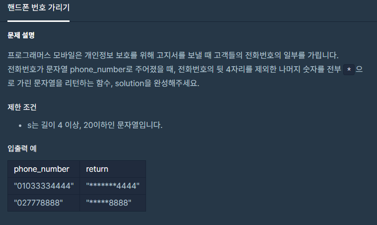 풀이 : 이전 * 찍기 문제 에서 사용했던 IntSreram 을 사용하여 뒷자리 4자리제외 * 채우기는 되었지만 이후 숫자에 대해 가져올방법이 떠오르지않아 SubString 으로 마무리. import java.util.stream.IntStream; class Solution { public String solution(String phone_number) { String answer = ""; StringBuilder sb = new StringBuilder(); IntStream.range(0,phone_number.length()-4).forEach(x -> sb.append("*")); sb.append(phone_number.substring(phone_number.length()-4,phone..