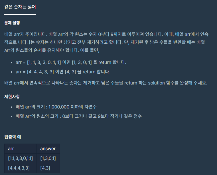 * 배열 arr가 주어집니다. 배열 arr의 각 원소는 숫자 0부터 9까지로 이루어져 있습니다. 이때, 배열 arr에서 연속적으로 나타나는 숫자는 하나만 남기고 전부 제거하려고 합니다. 단, 제거된 후 남은 수들을 반환할 때는 배열 arr의 원소들의 순서를 유지해야 합니다