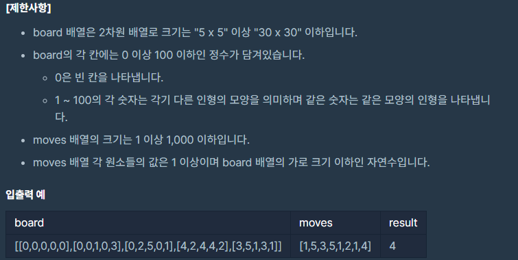 문제 : 게임 화면의 격자의 상태가 담긴 2차원 배열 board와 인형을 집기 위해 크레인을 작동시킨 위치가 담긴 배열 moves가 매개변수로 주어질 때, 크레인을 모두 작동시킨 후 터트려져 사라진 인형의 개수를 return 하도록 solution 함수를 완성하시오!