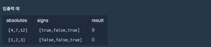 문제 풀이 : Sign 의 boolean 에따라 absolutes 의 숫자를 가져와 += / -= 진행 하여 값을 가져온다!