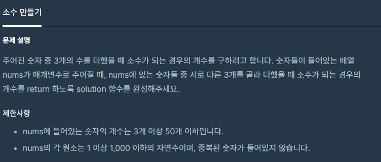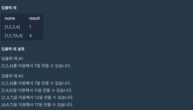 풀이 : 다중 For 문을 사용하여 3개의 수를 찾고 3개의 수의 합에대하여 소수인지를 판명한다.