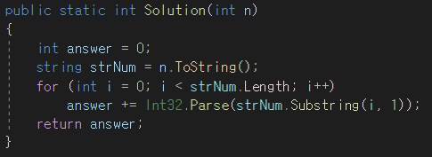 문제 : 자연수 N이 주어지면, N의 각 자릿수의 합을 구해서 Return 하는 Solution 함수를 만들어 주세요.