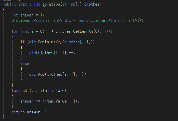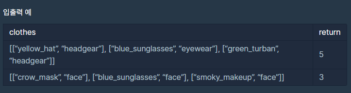스파이가 가진 의상들이 담긴 2차원 배열 clothes가 주어질 때 서로 다른 옷의 조합의 수를 return 하도록 solution 함수를 작성해주세요.