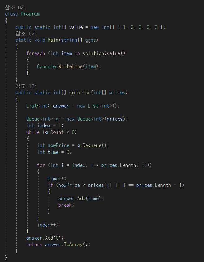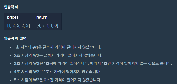 문제 : 초 단위로 기록된 주식가격이 담긴 배열 prices가 매개변수로 주어질 때, 가격이 떨어지지 않은 기간은 몇 초인지를 return 하도록 solution 함수를 완성하세요.