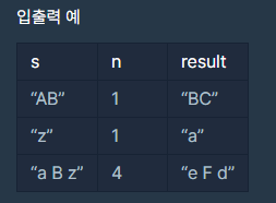 문제 : 어떤 문장의 각 알파벳을 일정한 거리만큼 밀어서 다른 알파벳으로 바꾸는 암호화 방식을 시저 암호라고 합니다. 예를 들어 AB는 1만큼 밀면 BC가 되고, 3만큼 밀면 DE가 됩니다. z는 1만큼 밀면 a가 됩니다. 문자열 s와 거리 n을 입력받아 s를 n만큼 민 암호문을 만드는 함수, solution을 완성해 보세요.
